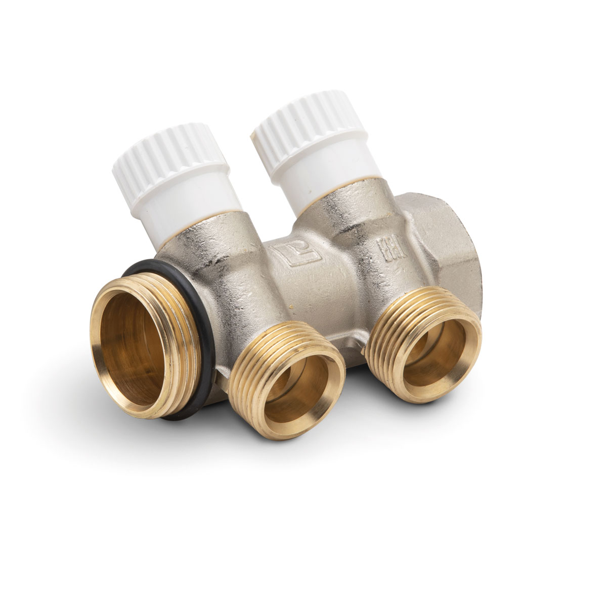 Colector modular sencillo con roscas internas de 2 vías y válvulas de cierre. Conexión de tubo de cobre y plástico (W24x19). Conforme al Decreto Ministerial 174/2004.