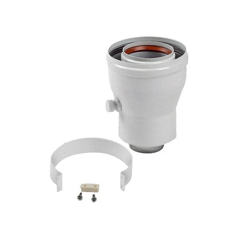 Kit salida vertical y adaptador para caldera condensación ARISTON 3318095 80/125. Adaptador terminal de humos. Salida vertical con abrazadera de manguera, junta y tornillos de fijación. El adaptador puede colocarse en la caldera o en las tuberías.