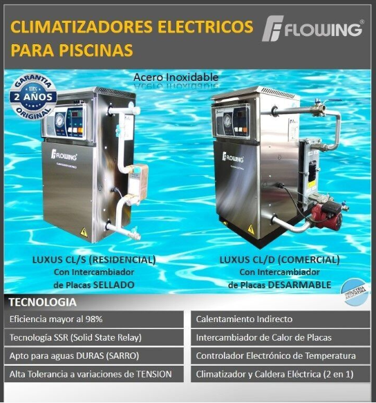 Los exclusivos climatizadores de piscina eléctricos Flowing Serie Luxus CL para piscinas, están diseñados para ser instalados directamente en los sistemas de filtración, permitiendo disfrutar todo el año con el más alto confort. Adicionalmente, pueden trabajar en sistemas de calefacción por agua con radiadores, piso radiante o fan-coils. Con sólo un equipo tiene doble prestación!